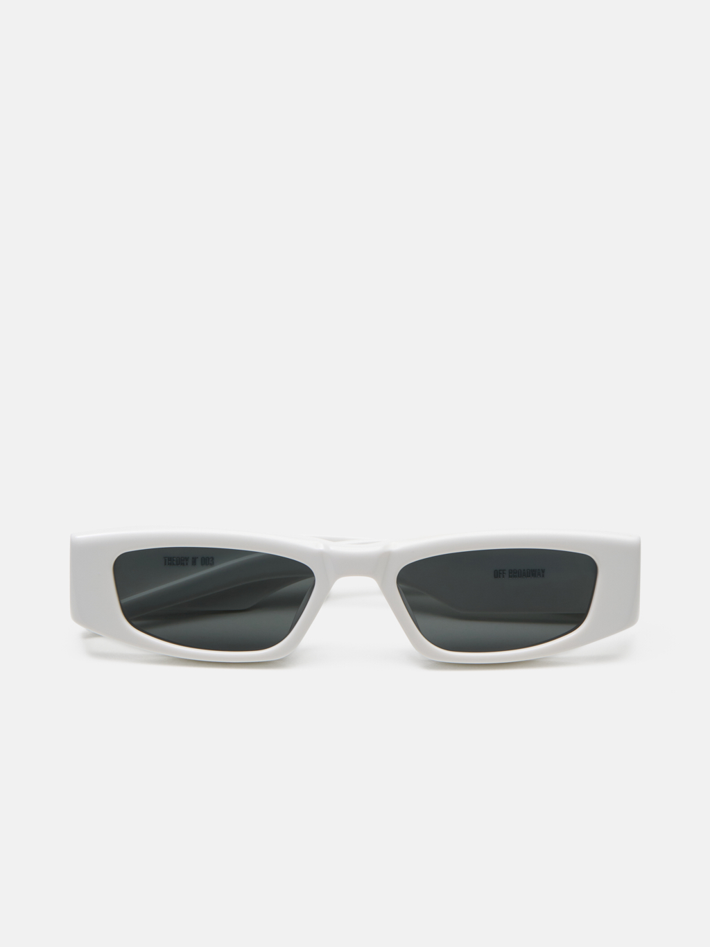 'THEORY NUMBER 003 (띠어리 넘버 003)' 선글라스는 블랙 아세테이트로 제작된 두꺼운 프레임과 낮은 사각형 형태가 특징이며, 곧고 두꺼운 다리에 더해진 금속 장식이 세련된 감각을 더합니다.