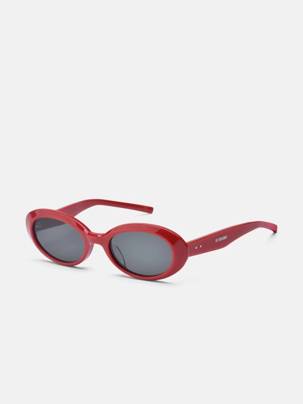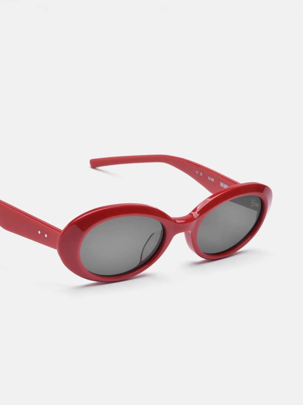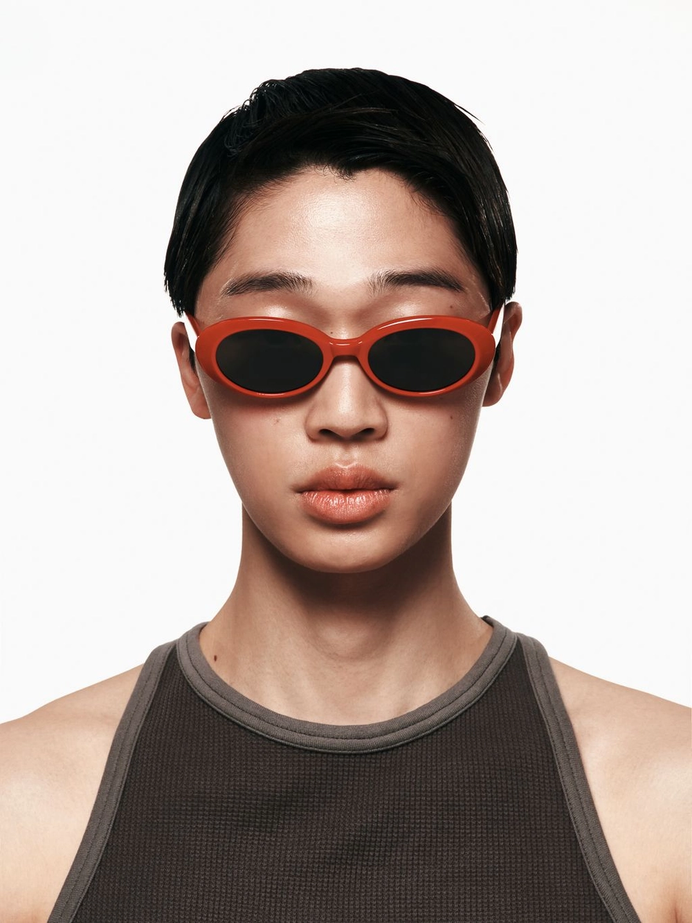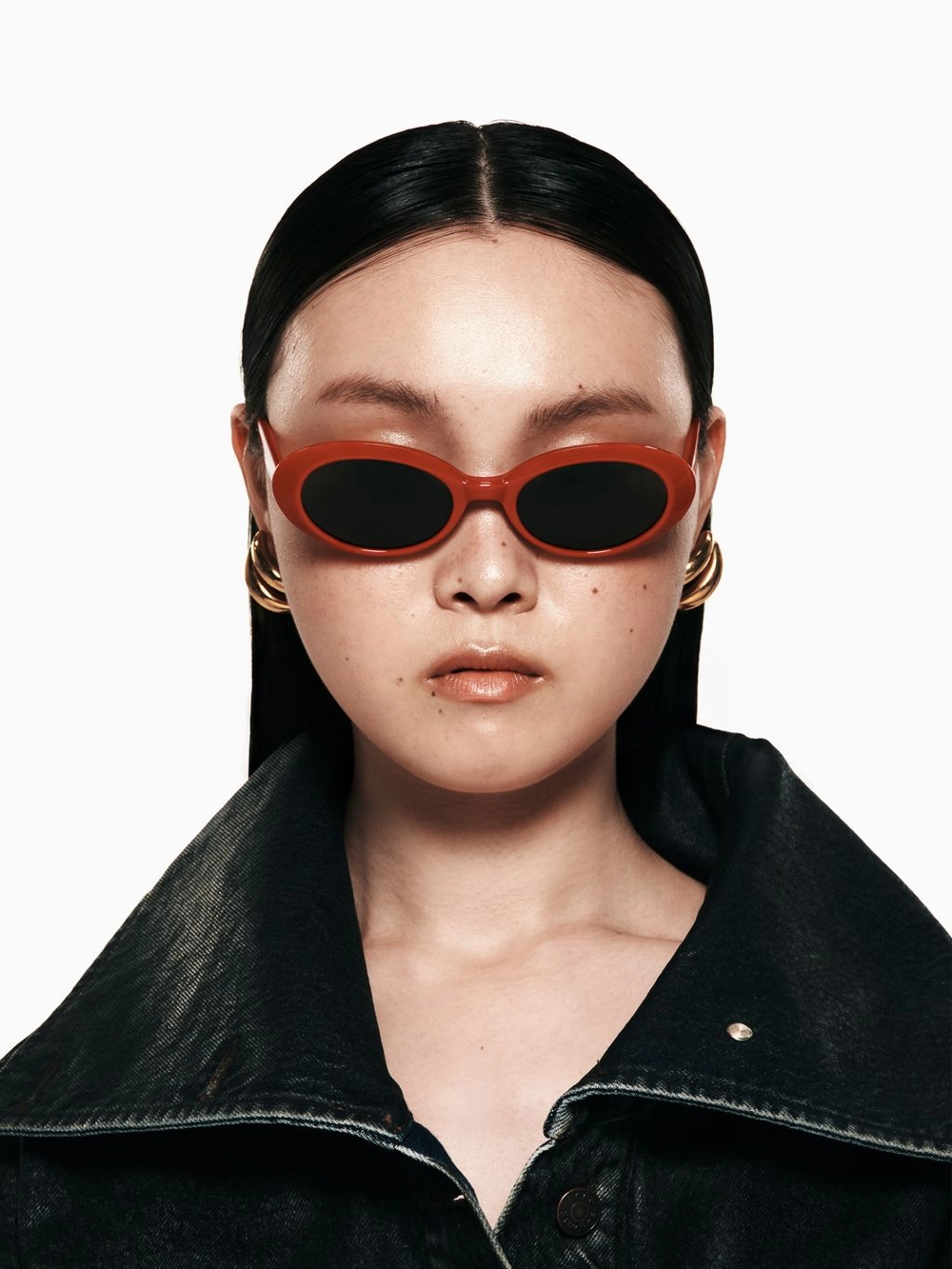 타원형 모습에 가는 테와 프랫 렌즈를 더해 가볍게 착용할 수 있습니다. 앞부분의 구조적인 비스듬한 선이 현대적인 멋을 살려 주며, 붉은빛 아세테이트가 과감한 스타일을 완성합니다.