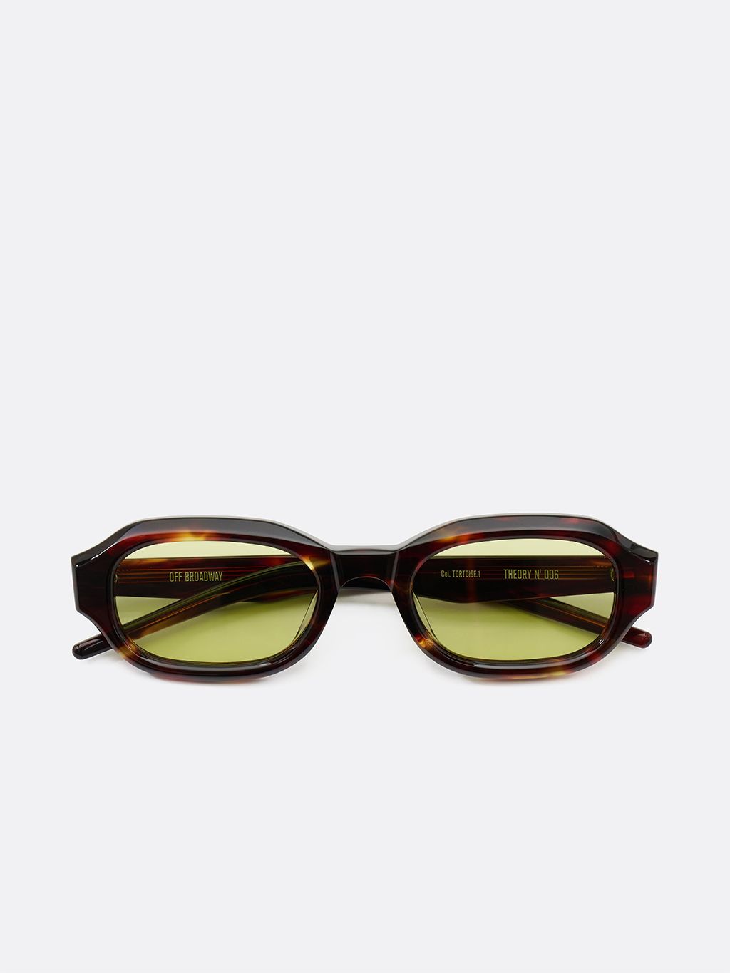 'THEORY NUMBER 006 (띠어리 넘버 006)' 선글라스는 안정적으로 다듬어진 스퀘어 쉐입과 볼륨감 있는 템플이 특징이며, 템플에 새겨진 오프브로드웨이 로고와 리벳 장식이 세련된 무드를 더합니다.